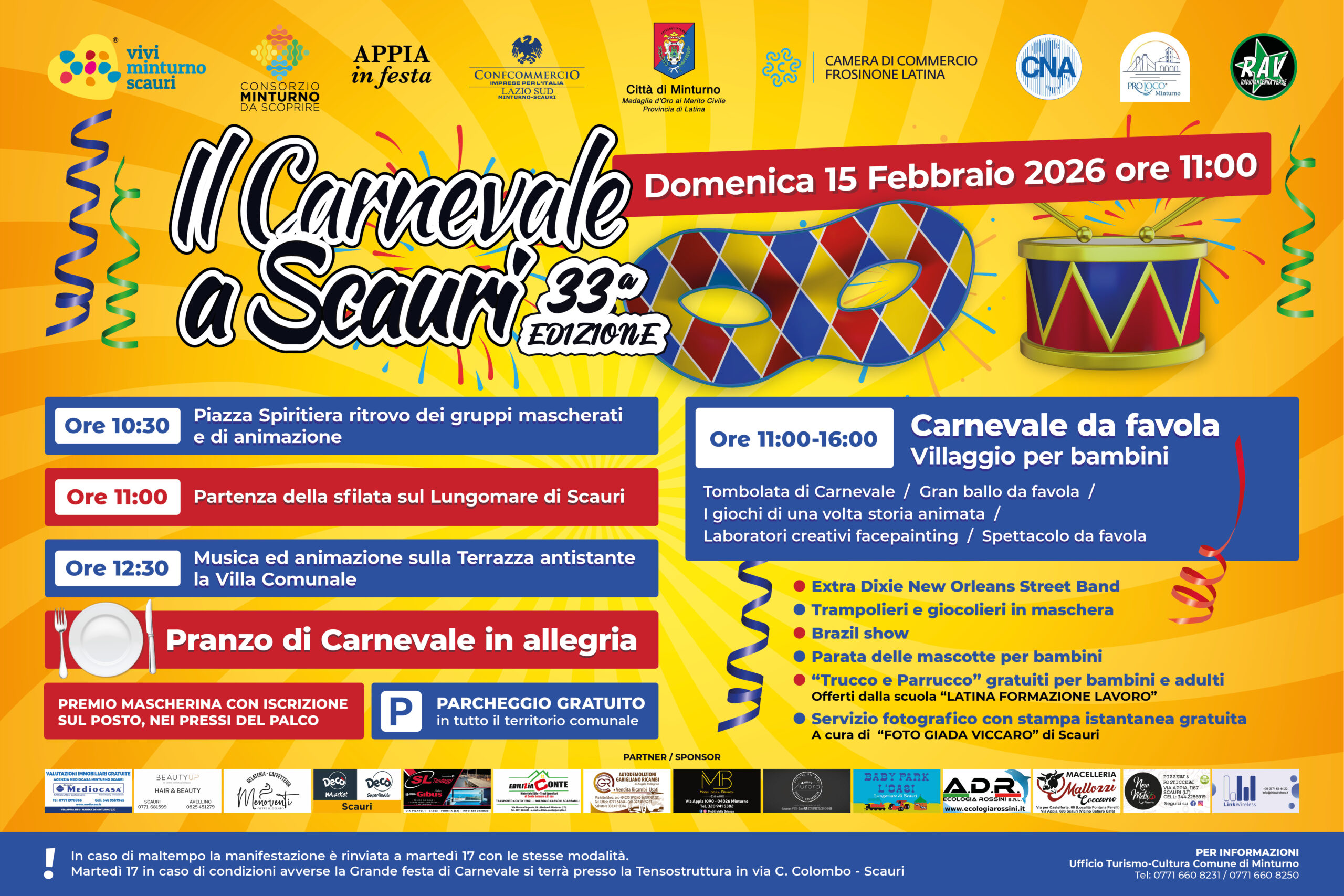 Scauri si prepara a vestirsi di musica, colori e sorrisi per uno degli appuntamenti più attesi dell’anno. Domenica 15 febbraio 2026 torna il Carnevale a Scauri, che celebra la sua 33ª edizione, confermandosi una delle manifestazioni più amate e partecipate del territorio.